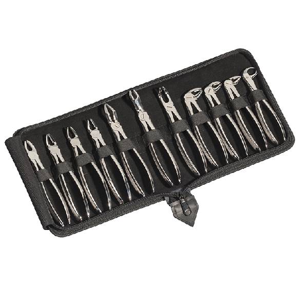 Kit completo de fórceps para exodoncia.